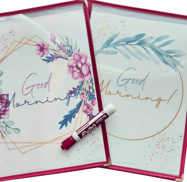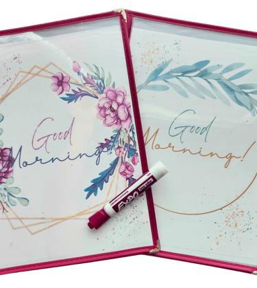 We use morning menus—simple folders with clear sleeves—updated daily using whiteboard markers. Inside each one, I’ve placed: